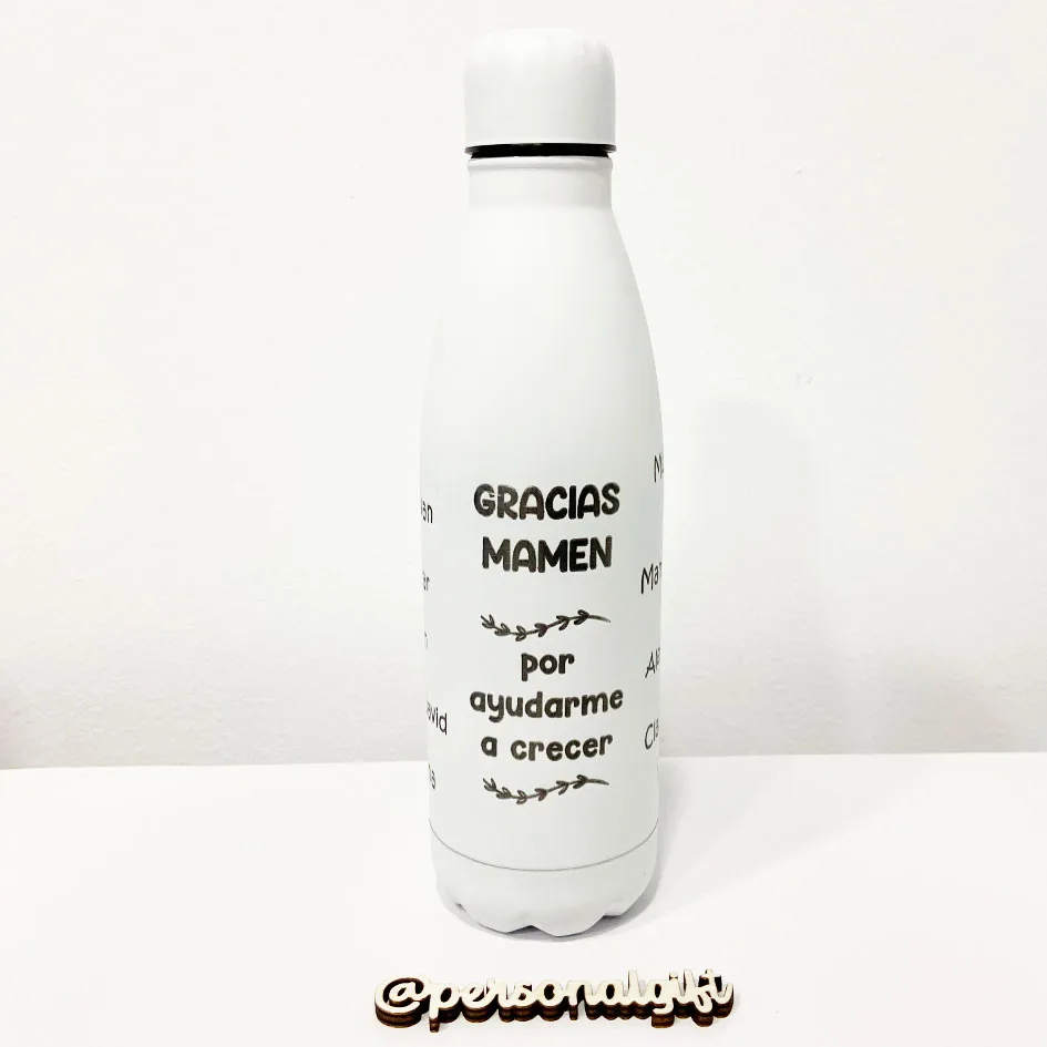 Botella grabada con frase y nombres de los niños de la clase