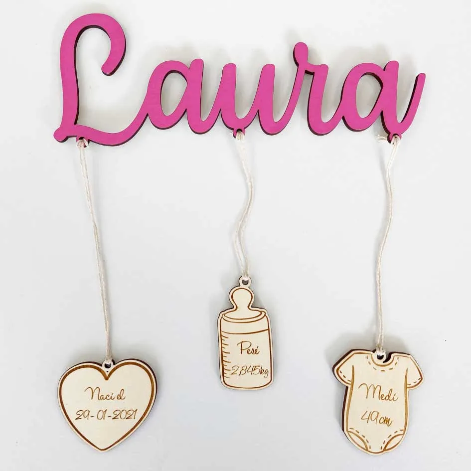 Nombre con decoración personalizado peso, medida y el día que nació.